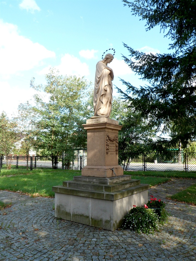 Piękna rzeźba pochodzi z 1856 r. i jest dziełem rzeźbiarza Konstantego Hegla, twórcy m.in. warszawskiej Syrenki. Obelisk ufundował właściciel Pęcic Leon Popławski. Postać Matki Boskiej z beżowego piaskowca ustawiona jest na cokole z tego samego materiału. Na podstawie znajduje się napis: „O Maryo! Bez zmazy poczęta, módl się za nami, którzy się do Ciebie uciekamy”.