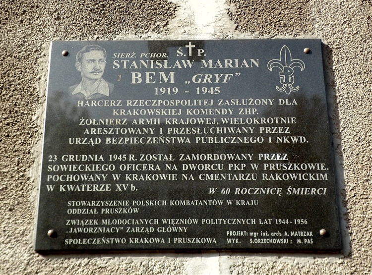 Stanisław Marian Bem (ur. w 1919 r. w Warszawie) był harcerzem, członkiem Krakowskiej Drużyny Harcerzy "Zielona Trójka" oraz współpracownikiem Komendy ZHP w Krakowie. W czasie II wojny światowej brał udział w konspiracji jako sierżant podchorąży Armii Krajowej. Posługiwał się pseudonimem „Gryf”. Po zakończeniu wojny Stanisława Bema wielokrotnie zatrzymywały organa bezpieczeństwa za działalność w strukturach Armii Krajowej. Tragiczny był dla niego dzień 23 grudnia 1945 r. Podczas powrotu z podróży służbowej do Krakowa został zastrzelony na peronie stacji kolejowej w Pruszkowie przez sowieckiego oficera NKWD.