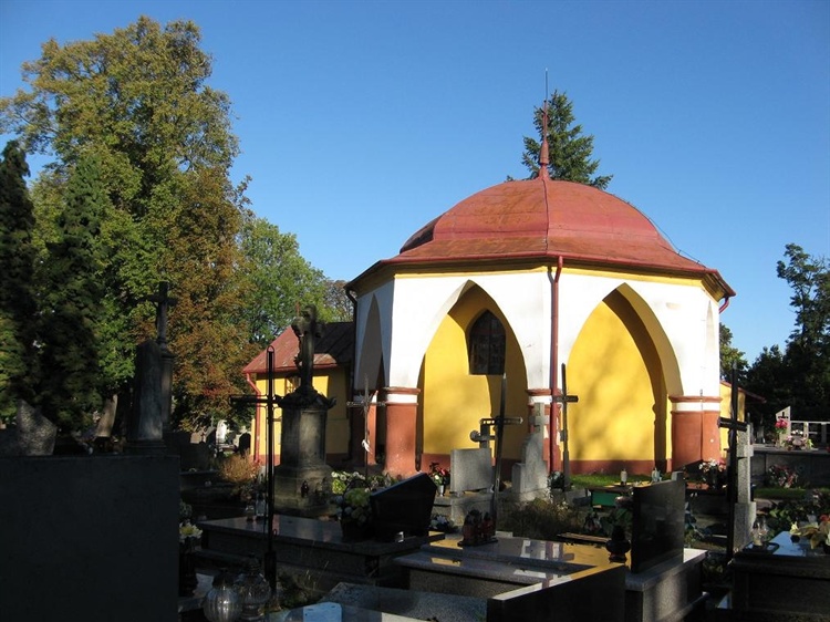 Kaplica cmentarna pochodzi z 1835 roku z fundacji Magdaleny i Józefa Długoszewskich. Jej ośmioboczna bryła opasana jest neogotyckimi ostrołukowymi arkadami wspartymi na filarach. Pół wieku później odnowili kaplicę i dobudowali kruchtę Tekla i Piotr Starzomscy. W 1899 roku w wyniku uderzenia piorunem spłonął dach, który odbudowano sześć lat później i dokonano remontu generalnego obiektu.