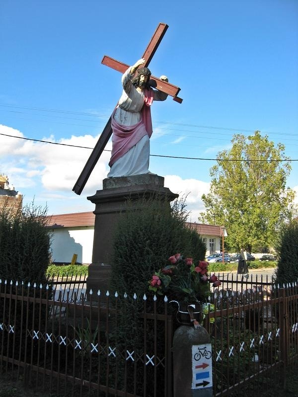 Przy skrzyżowaniu ulicy prowadzącej do opactwa cystersów w Wąchocku znajduje się figura - przedstawiająca polichromowaną postać Chrystusa dźwigającego krzyż. Posadowiona jest na wysokim cokole,całość wygrodzona metalowym płotkiem. Pochodzi z 1913 roku z fundacji ks. kanonika Edwarda Chrzanowskiego i wąchockich parafian dla upamiętnienia 1600-lecia nadania chrześcijaństwu swobody przez Konstantyna Wielkiego.