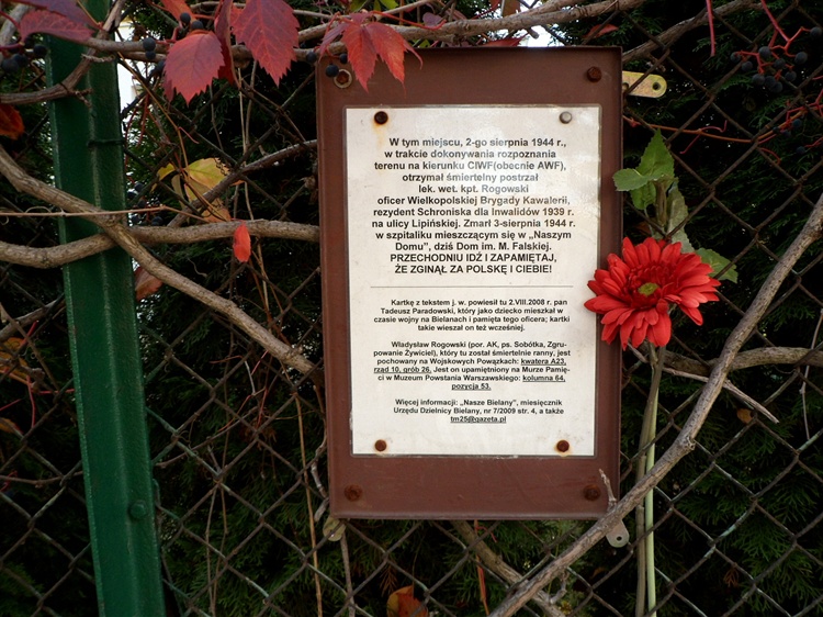 W czasie spaceru po warszawskiech Bielanach natrafiłem na niezwykłe miejsce pamięci odbiegające od tych fundowanych przez władze czy stowarzyszenia. Wspomnianym obiektem jest metalowa tablica z laminowaną kartką papieru wiszącą na płocie u zbiegu ulic Lipińskiej i Kasprowicza. Na kartce widnieje treść: "W tym miejscu 2-go sierpnia 1944 r., w trakcie dokonywnia rozpoznania terenu w kierunku CIWF (obecnie AWF) otrzymał śmiertelny postrzał lek. wet. kpt. Rogowski oficer Wielkopolskiej Brygady Kawalerii, rezydent Schroniska dla Inwalidów 1939 r. na ulicy Lipińskiej. Zmarł 3-go sierpnia 1944 r. w szpitaliku mieszczącym się w «Naszym Domu», dziś Dom im. M. Falskiej. Przechodniu, idź i pamiętaj, że zginął za Polskę i Ciebie!".