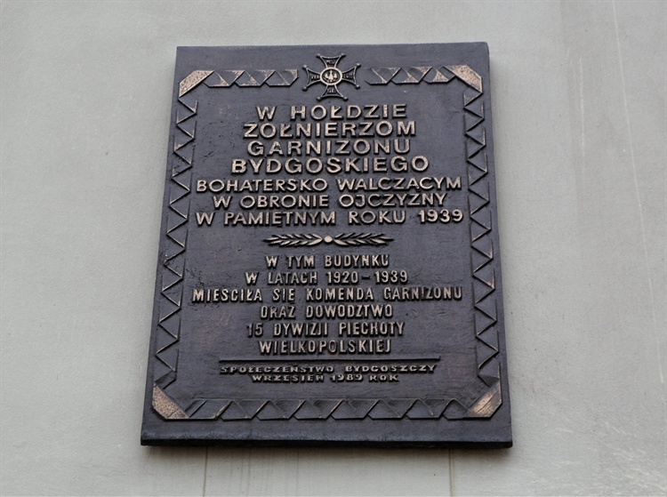 Bydgoszcz za czasów zaboru pruskiego była siedzibą silnego garnizonu wojskowego. Po zajęciu miasta przez Wojsko Polskie w 1920 r. obiekty wojskowe zostały obsadzone jego oddziałami. Stacjonowały tutaj jednostki niemal wszystkich rodzajów wojsk, od piechoty i ułanów, po oddziały zmechanizowane. We wrześniu 1939 r. żołnierze garnizonu bydgoskiego walczyli w obronie kraju przed hitlerowskimi wojskami. Wielu z nich poległo lub zostało rannych. W hołdzie bohaterskim obrońcom odsłonięto tablicę na ścianie dawnej siedziby komendy garnizonu przy ulicy Adama Czartoryskiego.