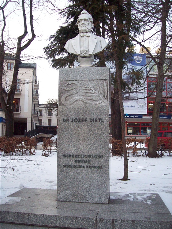 Pomnik Józefa Dietla zlokalizowany jest w Parku Dukieta od ulicy Zdrojowej. Odsłonięty został w 1900 roku według projektu Mieczysława Zawiejskiego. Pomnik ufundowali mieszkańcy Krynicy w dowód wdzięczności za zasługi dla rozwoju uzdrowiska. Józef Dietl był słynnym lekarzem, założycielem balneologii, i właśnie on jako pierwszy sklasyfikował polskie wody lecznicze.
