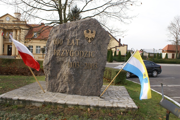 Rok 2003 to rok, w którym Przygodzice obchodziły rocznicę 600-lecia zaistnienia na kartach historii. Z tej okazji na Placu Powstańców Wielkopolski ustawiony został granitowy głaz-pomnik o wadze około 13,5 tony przywieziony z Kopalni Węgla Brunatnego „Adamów”. Na obelisku widnieje napis: „600 lat Przygodzic 1403-2003" oraz powyżej napisu, na sylwetce orła umieszczono dzieloną na pół, uproszczoną tarczę herbową miejscowości. W polu prawym tarczy widnieje głowa żubra z kolcem w nozdrzach, natomiast w polu lewym trzy trąby połączone w środku ustnikami.