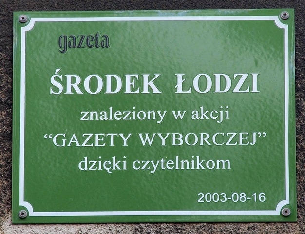 Każdy zapewne wie, że geometryczny środek Polski znajduje się w miejscowości Piątek w województwie łódzkim. Miasto Łódź również ma swój geometryczny środek. Pomysł wyznaczenia go powstał z inicjatywy "Gazety Wyborczej". W akcji szukania środka w tak dużej aglomeracji miejskiej brali udział mieszkańcy, historycy, rzeczoznawcy miasta. Po dokładnych pomiarach miasta uznano, że środek Łodzi znajduje się przy budynku na ul. Przędzalnianej 8. W dniu 16 sierpnia 2003 r. miejsce to oznaczono małą zieloną tabliczką, zamocowaną na elewacji budynku.