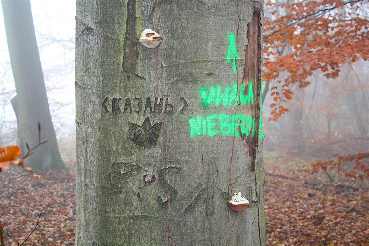 Zbliżając się do linii transzei, koniecznie powinniśmy zwrócić baczniejszą uwagę na pnie okolicznych buków. Na wielu z nich odczytać możemy przedziwne hasła. Spora część napisów pochodzi z okresu kopania rowów przez rosyjskich jeńców i okolicznych mieszkańców. Niektóre wyryto cyrylicą, inne opatrzono konkretną datą. Chociaż kaleczenie drzew uważane jest powszechnie za naganne, bez wątpienia buki z okolic Chyciny są intrygującymi świadkami minionych czasów.