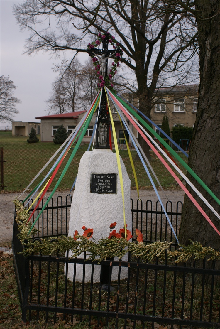 Żeliwny, ażurowy, Jeden z piękniejszych ozdobnych krzyży przydrożnych zdobiony motywami roślinnymi znajduje się przy wyjeździe z miejscowości Dworoszyce Kościelne, po prawej stronie drogi nr 42 prowadzącej w kierunku Pajęczna. W centralnej części krzyża znajduje się figura ukrzyżowanego Chrystusa, natomiast tuż przy kamiennej, bielonej podstawie w trzonie krzyża umieszczona została sylwetka kobiety z krzyżem trzymanym w prawej ręce. Krzyż został wzniesiony zapewnie w 1895 r. gdyż rok ten widnieje na tabliczce umieszczonej na kamiennym postumencie. Krzyż ozdobiony jest sztucznymi kwiatami i wstążkami oraz ogrodzony metalowym niskim płotkiem.