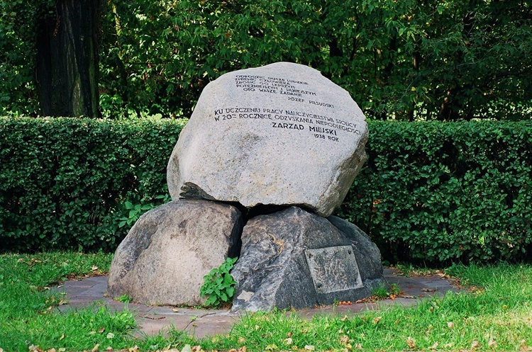 Obecnie na dolnym kamieniu nie ma już tablicy, zaś na największym głazie, wyryty jest napis: „Odrodzić dusze ludzkie, zmienić człowieka, zrobić go lepszym, potężniejszym i silniejszym – oto wasze zadanie. Józef Piłsudski”. Poniżej informacja: „Ku uczczeniu pracy nauczycielstwa stolicy w 20-stą rocznicę odzyskania Niepodległości. Zarząd Miejski 1938 rok”. Tenże kamień-pomnik został odsłonięty 12 listopada 1938 r., z okazji Dnia Nauczyciela w 20-stą rocznicę odzyskania niepodległości. Miał upamiętniać patriotyzm i zasługi nauczycieli Warszawy w ich walce o umysły i serca młodych Polaków wynaradawianych w szkołach zaborców, a także uhonorować trud wychowawczy już w niepodległej Ojczyźnie.