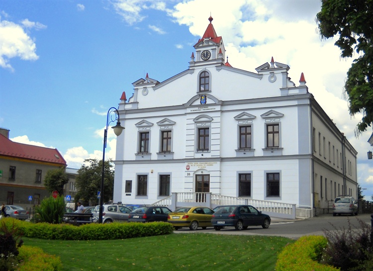 Żabno to niewielkie miasto nad Dunajcem w okolicach Tarnowa. Jego początki sięgają XII wieku, a położenie na szlaku handlowym na Węgry stworzyło warunki do jego rozwoju. Miasto było wielokrotnie niszczone. Spalone przez Tatarów potem przez Szwedów, a w końcu złupione przez wojska Rakoczego. Sami mieszczanie też kilkakrotnie przyczyniali się do pożarów Żabna. Po jednym z większych pożarów w 1888 roku, ówczesny burmistrz Franciszek Mazurkiewicz podjął decyzję, aby na kwaterze koło kościoła na której doszczętnie spaliły się domy, wznieść okazały ratusz.