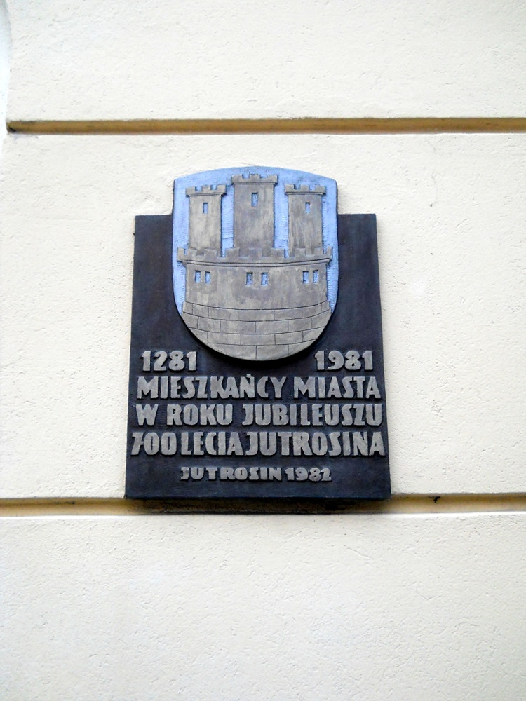 W 1981 roku Jutrosin obchodził jubileusz 700-lecia. Pierwsza wzmianka pochodzi bowiem już z 1281 roku. Jednak prawa miejskie Jutrosin otrzymał w 1534 roku. W roku jubileuszu mieszkańcy ufundowali tablicę pamiątkową, która znajduje się na ścianie ratusza, po prawej stronie od wejścia. Głównym elementem tablicy jest herb miasta.