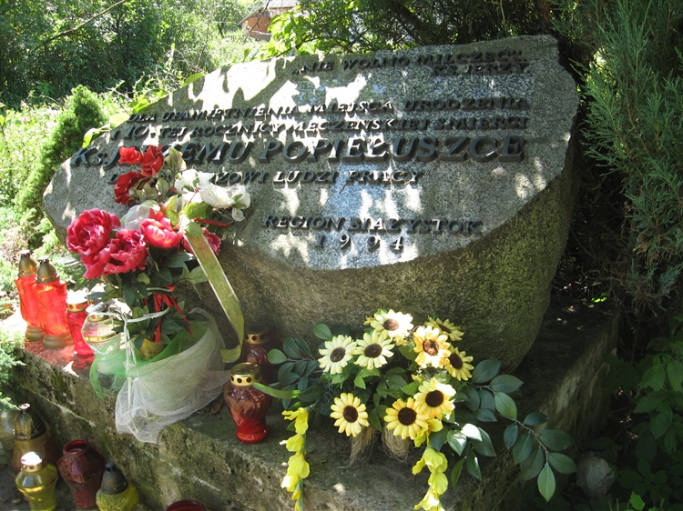 Pomnik księdza mieści się pod pięknym łukiem z krzyżem. W pobliżu zlokalizowany jest jego dom rodzinny w Okopach, a przy domu kamień z napisem: "Nie wolno milczeć" oraz miniaturowa kapliczka.