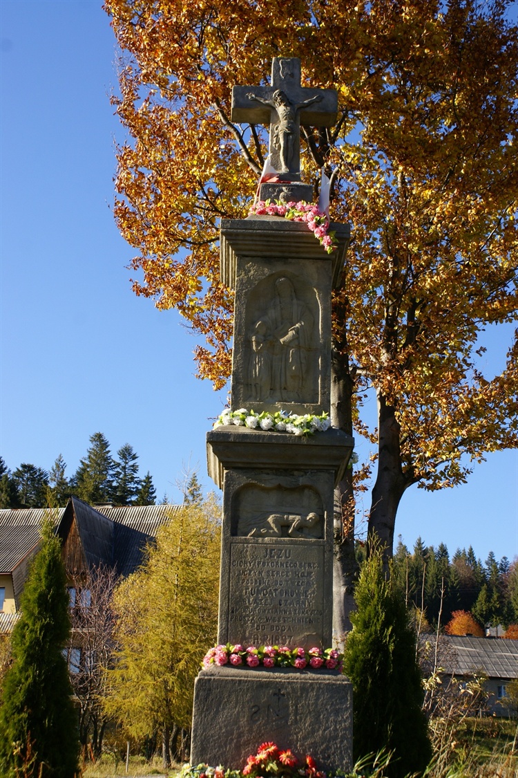 Przy drodze lokalnej w miejscowości Sidzina usytuowany został wykonany z kamienia piaskowego krzyż przydrożny z ukrzyżowanym Jezusem. Krzyż ustawiony jest na 3 częściowym postumencie wykonanym również z piaskowca, na którego ścianie frontowej oraz bocznych znajdują się w niewielkich wnękach figury świętych między innymi Jana Nepomucena, Antoniego czy św. Ignacego. Na środkowej części postumentu widnieje nazwisko fundatora oraz rok 1897 prawdopodobnie rok jego wykonania. Nad napisem „JESU CICHY I POKORNEGO SERCAUCZYŃ SERCE MOJE PODOBNE DO TWEGO” została wykonana płaskorzeźba przedstawiająca Jezusa upadającego pod ciężarem krzyża. Krzyż oraz postument przyozdobione zostały sztucznymi kwiatami.