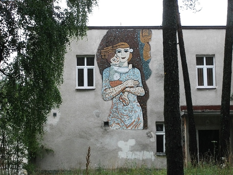 W czasie spaceru napotkać można na ścianie dawnego przedszkola charakterystyczną dla sztuki socrealistycznej mozaikę. Kompozycja z kolorowych szkieł przedstawiająca kobietę z dzieckiem na ręku widoczna jest na murze od strony ulicy Orła Białego. Za czasów bytności żołnierzy radzieckich takich ozdób było tutaj znacznie więcej.