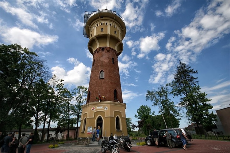 Wieżę ciśnień wybudowana została w 1905 roku przez gdańską firmę „A W. Muller" i stanowiła element miejskiej sieci doprowadzającej wodę dla mieszkańców miasta. W całości jest wzniesiona z czerwonej cegły w kształcie koła. W parterze, zewnętrzne ściany ukształtowano w formie sześciokąta. Budowla ma wysokość 46,5 metra, siedem kondygnacji. Mieszczący się w niej zbiornik mieścił około 250 m3 wody. Wieża oparła się zniszczeniom obu wojen. Została zniszczona tylko w niewielkim stopniu, były to głównie uszkodzenia ścian po ostrzałach.