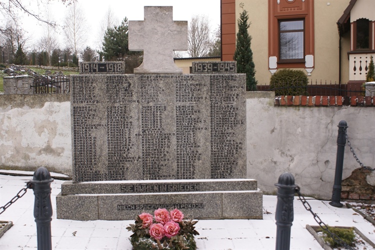 Na terenie kościoła pw. św. Katarzyny Aleksandryjskiej stoi prosty pomnik poświęcony mieszkańcom poległym, zaginionym lub zamordowanym w czasie I i II wojny światowej. Na tablicy widnieje 51 nazwisk poległych w latach 1914 -1918 oraz 145 nazwiska tych, którzy stracili życie w latach 1939 - 1945. Na podstawie pomnika znajduje się dwujęzyczny napis „NIECH SPOCZYWAJĄ W POKOJU”.