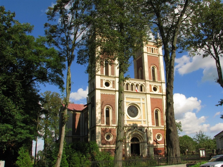 Kościół budowano w latach 1860-74 według projektu Stanisława Gołębiowskiego. Jest to neoromański, murowany kościół usytuowany pośród drzew, z dwu wieżową fasadą, doskonale widoczny z oddali. We wnętrzu znajdują się klasycystyczne ołtarze, a także ciekawy konfesjonał z malowanymi ornamentami.