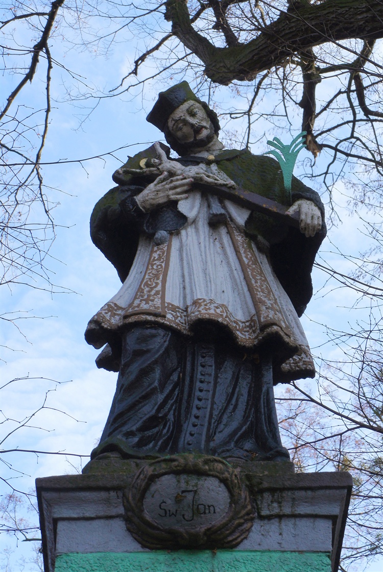 W parku zespołu pałacowego w Krowiarkach, niedaleko bramy do nieistniejącego już drewnianego kościółka, trafiamy na XVIII wieczną, barokową,postawioną na cokole, który powstał w czasie późniejszym, figurę św. Jana Nepomucena . Najprawdopodobniej rzeźba Jana powstała w warsztacie Johannesa Nitsche, którego na Górny Śląsk ściągnął hrabia Antoni von Gaschin.