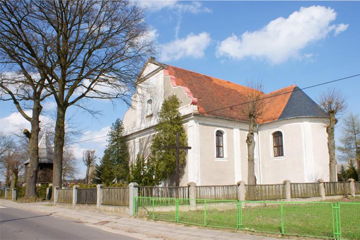 Ten kościół z cegły wzniesiony został w 1800 r. na planie krzyża przez Feliksa i Wiktora Szołdrskich. W świątyni znajduje się krucyfiks i obraz Aniołów Stróżów. Przy kościele stoi dzwonnica z około 1800 r. Zarówno kościół, jak i dzwonnica są obiektami wpisanymi do rejestru zabytków. Przy parafii funkcjonował szpital (w zasadzie przytułek), spłonął w 1888 r.