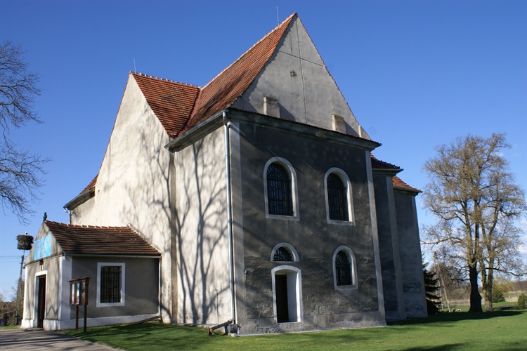 Pierwszy kościół w miejscowości został wzniesiony prawdopodobnie w 1308 r. Był to niewielki drewniany kościółek pełniący rolę kaplicy dworskiej. Świątynia ta została podobno zniszczona przez pożar.