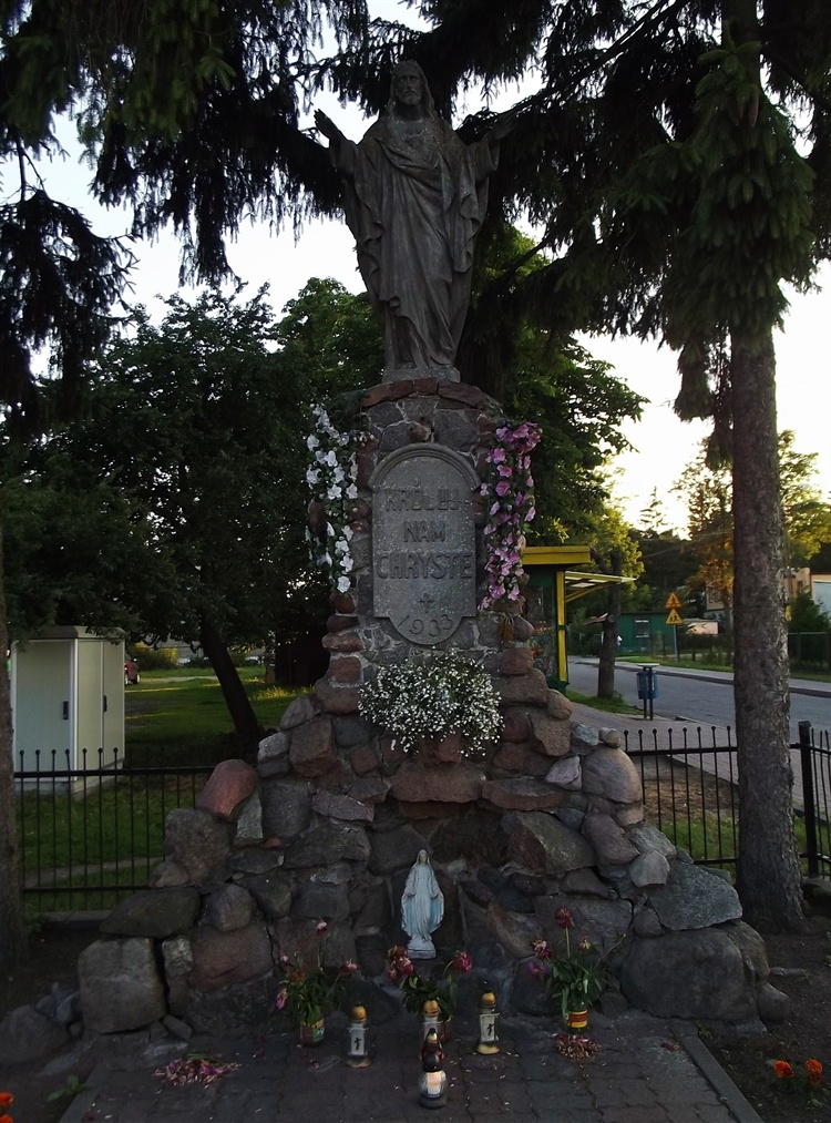 W centrum Krasnego, w pobliżu kościoła i plebanii, przy drodze wiodącej w jednym kierunku do miejscowego, zabytkowego parku i słynnej kraśnieńskiej stadniny, zaś w drugim, zachodnim do miejscowego cmentarza, znajduje się ponad metrowej wysokości figura Pana Jezusa Miłosiernego. Ustawiona jest na wymurowanym z kamieni polnych niewielkim kopczyku. Na jego szczycie w uformowanym również z kamieni niewielkim cokoliku, wmurowana jest tablica o następującej treści: „Króluj nam Chryste 1933”. U podstawy kopczyka we wnęce stoi mała figurka Najświętszej Maryi Panny Niepokalanie Poczętej. Kopiec z rzeźbą Chrystusa Pana otoczony jest metalowym ogrodzeniem.