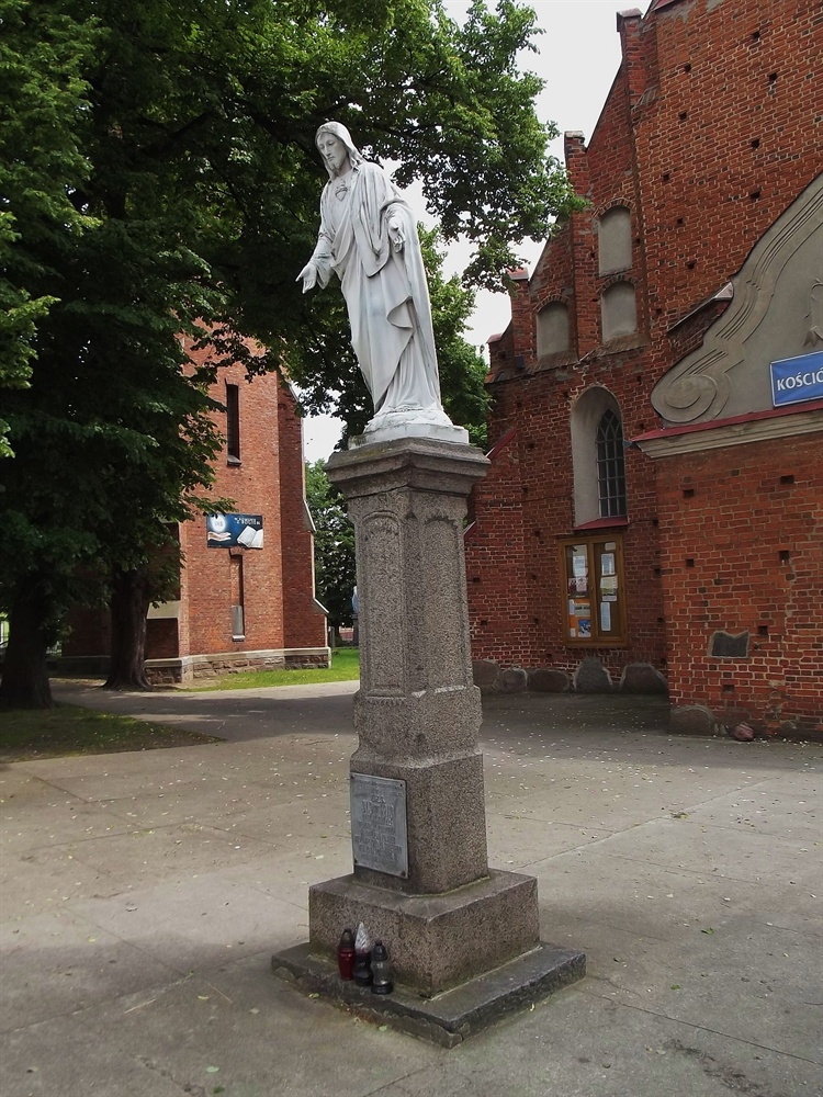 Przed makowskim kościołem stoi stuletnia już figura Pana Jezusa Miłosiernego. Na postumencie, na którym ustawiono rzeźbę Chrystusa Pana, umieszczono tabliczkę, której treść brzmi: „A Królestwu Jego nie będzie końca. Łuk.1.33. I.H.S. 313-1913 Bogu na Chwałę, Bliźnim ku Zbawieniu, Na Wieczną Pamięć Tryumfu Krzyża Świętego Ten Znak Poświęcają Parafianie Makowscy: I.W., S.A., I.P.”