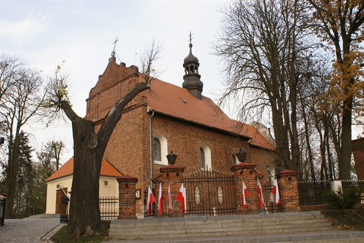 Na szczycie jednego ze wzgórz moreny czołowej w XVI w. został wzniesiony murowany, późnogotycki kościół. Świątynię rozbudowano w 1684 r. W późnobarokowym wyposażeniu kościoła warto wyróżnić: ołtarz główny z rzeźbami i XVII-wiecznym krzyżem oraz ukrzyżowanym Chrystusem, cztery ołtarze boczne z XVIII w. czy też dwa obrazy Stanisława Szembeka. Stanisław hr. Szembek, malarz, ziemianin i kolekcjoner, mieszkał tu i pracował w latach 1879-1891. W kościele znajduje się grób i epitafium rodziny Szembeków. Obok świątyni zbudowana została ceglana, arkadowa dzwonnica.