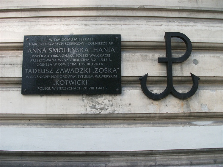 Na ścianie budynku przy ulicy Koszykowej 75 wisi tablica pamiątkowa poświęcona harcerzom Szarych Szeregów i żołnierzom Armii Krajowej, którzy mieszkali tutaj w czasach okupacji. Na tablicy przeczytać możemy tekst o treści: "W tym domu mieszkali harcerze Szarych Szeregów - żołnierze AK Anna Smoleńska «Hania», współautorka znaku Polski Walczącej, aresztowana wraz z rodziną 3 XI 1942 r., zginęła w Oświęcimiu 19 III 1943 r. Tadeusz Zawadzki «Zośka», wyróżniony honorowym tytułem wawerskim «Kotwicki», poległ w Sieczychach 20 VIII 1943 r." Obok umieszczono kotwicę Polski Walczącej.