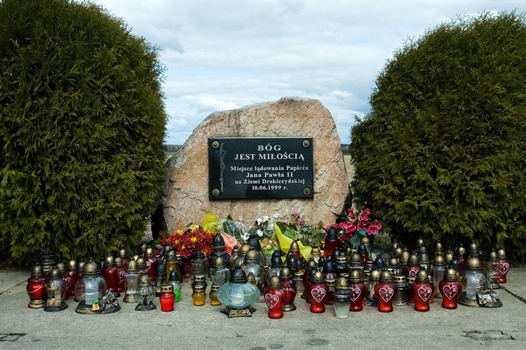 10 06 1999 w tym miejscu wylądował śmigłowiec z Papieżem Janem Pawłem II na pokładzie podczas wizyty w Drohiczynie. Obecnie znajduje się tu kamień z tablicą upamiętniającą to wydarzenie