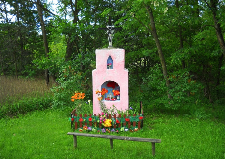 Kapliczka przydrożna, którą prezentuję, stoi sobie trochę dalej za Kurzyną, Za Wygonem. Tak się nazywa ten rejon Lasów Janowskich. To jedna z tras prowadzących poprzez Biłgoraj na Roztocze. Kapliczka pozostała zapewne po czasach, kiedy żyli tu zgodnie Polacy, Rusini, Niemcy i Żydzi. Jest prosta, murowana, pomalowana na kontrastowy, różowy kolor. W największej niszy znajduje się kopia cudownego obrazu Matki Bożej Pocieszenia w Leżajsku. Kapliczka jest bardzo wiekowa gdyż na moje pytanie, od kiedy ona tu stoi, starsze mieszkanki Wygonu mówiły, że ich prababki modliły się przy niej na majówkach. Z uwagi na jej kolor, nie sposób jej nie zauważyć pośród zieleni.