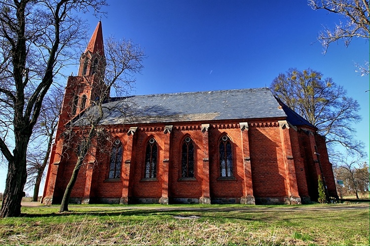 Zbudowany został z cegły na planie prostokąta w stylu neogotyckim. Posiada oskarpowany korpus z węższym i niższym, trójbocznie zamkniętym prezbiterium od wschodu i kwadratową wieżą od zachodu.