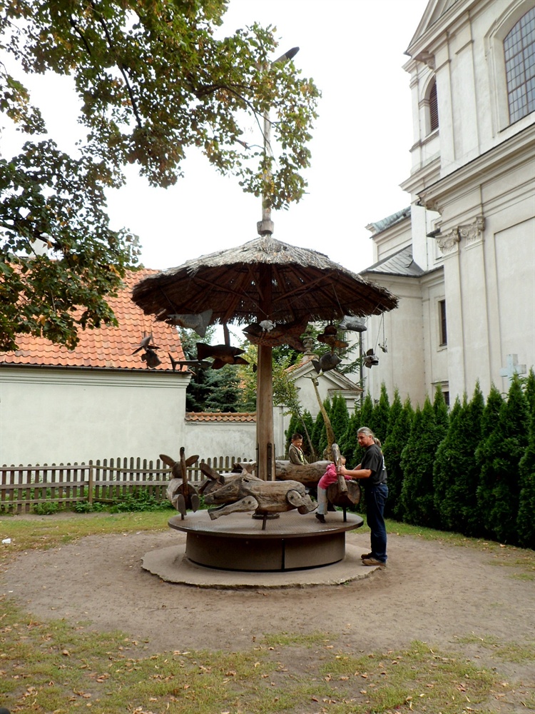 Na początku XXI wieku przy kościele kamedułów na Bielanach pojawiła się oryginalna karuzela. Jej twórcą był artysta Józef Wilkoń, znany ilustrator książek, ale także intrygujący rzeźbiarz. Karuzelę zdobią charakterystyczne dla jego twórczości drewniane figurki zwierząt, nad którymi wirują ryby wykonane z drewna i metalu. Karuzelę miał napędzać osioł Franciszek, ale nie był chętny do tej pracy. Pozostawiony przy kościele dał impuls Józefowi Wilkoniowi do stworzenia niezwykłej szopki, całorocznej atrakcji Bielan.