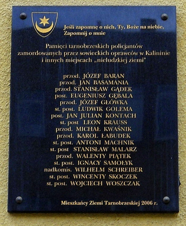 W dniu 28 lipca 2006 roku na budynku Policji w Tarnobrzegu odsłonięta została tablica upamiętniająca policjantów z powiatu tarnobrzeskiego poległych na "nieludzkiej ziemi". Nad 17 nazwiskami zamordowanych przez sowieckich oprawców widnieje inskrypcja: "Jeśli zapomnę o nich, Ty, Boże na niebie, zapomnij o mnie". Tablicę wykonano z inicjatywy Tarnobrzeskiego Towarzystwa Historycznego.