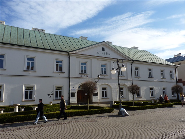 Muzeum Okręgowe w Rzeszowie posiada bogate zbiory z zakresu sztuki i rzemiosła artystycznego, wyposażenia wnętrz, historii, archeologii, obejmujące łącznie ok. 250 000 eksponatów. Tylko część z nich tworzy stałą ekspozycję, inne pokazywane są na wystawach czasowych. Na parterze budynku znajduje się wystawa malarstwa zachodnioeuropejskiego, obejmująca głównie dzieła z kolekcji zwanej „Galerią Dąmbskich”, powstałej na przełomie XVIII i XIX wieku. Stanisław Dąmbski, właściciel Rudnej koło Rzeszowa, przekazał w 1903 r. rodową galerię w depozyt Magistratowi Miasta Rzeszowa. Po II wojnie światowej poważnie uszczuplona kolekcja znalazła się w posiadaniu muzeum. Obecnie liczy ona około 160 obrazów, pochodzących z XVII−XIX w. Tworzą ją oryginalne prace tzw. małych mistrzów szkoły włoskiej, francuskiej, niemieckiej i austriackiej, jak i kopie dzieł wielkich mistrzów europejskich: Rafaela, Rembrandta, Rubensa i innych. Ekspozycję uzupełniają stylowe meble z XVIII−XIX w., w tym kilka tzw. Kolbuszowskich oraz liczne drobne przedmioty, ozdoby itp. W tzw. sali aptecznej pokazana jest kolekcja starej porcelany, w tym wyroby ze słynnej manufaktury miśnieńskiej. W dawnym refektarzu znajduje się m.in. okazała szafa gdańska z 1700 r. oraz dwa duże XVIII-wieczne portrety Mniszchów. W korytarzach piętra ulokowana jest galeria malarstwa polskiego, obejmująca okres od XVIII do początków XX w. W kilku salach eksponowana jest wystawa archeologiczna, zatytułowana „Kamień, brąz i żelazo”. Ilustruje ona pradzieje województwa podkarpackiego, od epoki kamiennej po wczesne średniowiecze. Zgromadzono tu liczne zabytki kamienne, brązowe i żelazne oraz ceramikę (naczynia, broń, narzędzia i ozdoby) zebrane z licznych wykopalisk. Jest tu największa w kraju ekspozycja zabytków z okresu wczesnego neolitu, nie spotykany w innych muzeach Polski zespół zabytków scytyjskich (żelazny miecz tzw. akinakes z V w. p.n.e.), rzadkie znaleziska z najstarszego okresu (VI w. n.e.) ekspansji Słowian oraz słynny skarb (V w. n.e.) z podrzeszowskiej Świlczy. Wystawę uzupełniają zdjęcia, plansze i mapy.