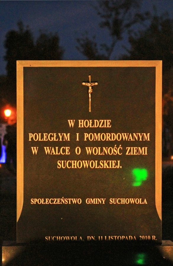 W 2010 roku odsłonięto pomnik poświęcony pomordowanym i poległym w walce o wolność Ziemi Suchowolskiej. Pomnik został postawiony przez społeczeństwo Suchowoli w Parku Miejskim. 11 listopada 2010 roku podczas trwania uroczystości obchodów 92. rocznicy odzyskania niepodległości ksiądz proboszcz Witold Skrouba dokonał poświęcenia pomnika.