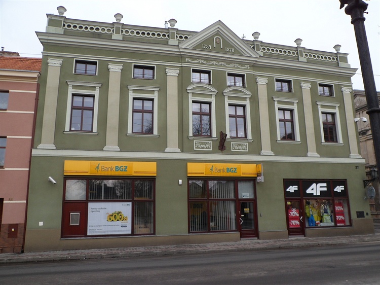 Pierwotny dom wzniesiono w XVIII w., a przebudowano w 1878 r., nadając mu neoklasycystyczną formę. Budynek wyróżnia się ładną fasadą ozdobioną pilastrami o jońskich głowicach. Kamienica, nazywana Domem Wiejskim, była w okresie powojennym siedzibą Rawickiej Spółdzielni Pracy Handlowo-Produkcyjnej. Dziś w sprywatyzowanym i pięknie odnowionym budynku mieści się oddział banku BGŻ.