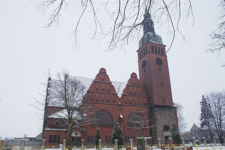 Kościół ewangelicki wzniesiony w stylu neogotyckim na planie krzyża z piaskowca i czerwonej cegły. Nad dwuspadowym dachem wznosi się sześciokondygnacyjna wieża z tarczami zegarowymi nakryta czworobocznym kopulastym hełmem zwieńczonym iglicą z kulą. Świątynia została zbudowana w latach 1910 – 1911. Poświęcenie kościoła p.w. Chrystusa Króla miało miejsce 22.09.2011 r. Obecnie pomocniczy kościół rzymsko-katolicki p.w. św. Józefa.