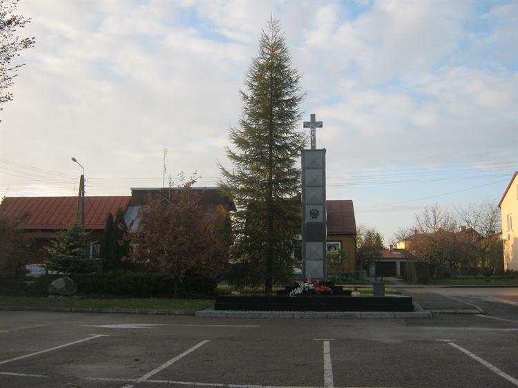 Na placu w niedalekiej odległości od kościoła znajduje się pomnik – krzyż. Został on wzniesiony jako wotum w 10-tą rocznicę odzyskania przez Polskę niepodległości w 1928 r . W 2006 został odnowiony, zamontowano na nim tablicę ze słowami Jana Pawła II: „Pozostańcie wierni doświadczeń pokoleń, które żyły na tej ziemi z Bogiem w sercu i z modlitwą na ustach… Zachowujcie jak skarb największy wszystko to, co było źródłem duchowej siły naszych ojców”. Uroczystego poświęcenia krzyża w dniu 16 maja 2006 r. dokonał ks. bp Stanisław Stefanek. Jest to miejsce, przed którym odbywają uroczystości religijno-patriotyczne.