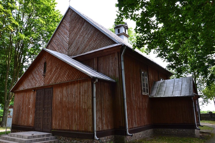 Obecny wzniesiono w latach 1712-39 z fundacji Ludwika Antoniego Lasockiego – starosty zakroczymskiego i Tomasza Rumockiego z Nieborzyna. Konsekrowany w 1739 r., restaurowany w latach ok. 1754, 1779-80 i 1964. Świątynia orientowana, konstrukcji zrębowej wzmocnionej lisicami, zewnątrz oszalowana z olistwowaniem, z dachem krytym blachą. Nawa prostokątna, prezbiterium węższe, zamknięte trójbocznie. Przy nawie dwie kruchty – główna od zachodu i boczna od południa, przy prezbiterium od północy zakrystia. Nad nawą i prezbiterium oddzielne dachy dwuspadowe, nad kruchtami daszki dwuspadowe, nad prezbiterium od wschodu trzyspadowy, nad zakrystią pulpitowy. Na kalenicy nad nawą czworoboczna wieżyczka na sygnaturkę. Obita blachą, zwieńczona cebulastym, blaszanym hełmem. Wnętrza jednonawowe, przekryte nowym stropem belkowym. Węższe prezbiterium oddzielone od nawy belką tęczową, na której krucyfiks z XVIII w. oraz inskrypcja (z prawej strony): „ANNO DOMINI 1712 DIE 19 FEBRUARY”. Chór muzyczny wsparty na czterech słupach. Wyposażenie wnętrza: ołtarze barokowe (1. ćw. XVIII w.), ambona barokowa (1. ćw. XVIII w.), chrzcielnica z XVIII w.