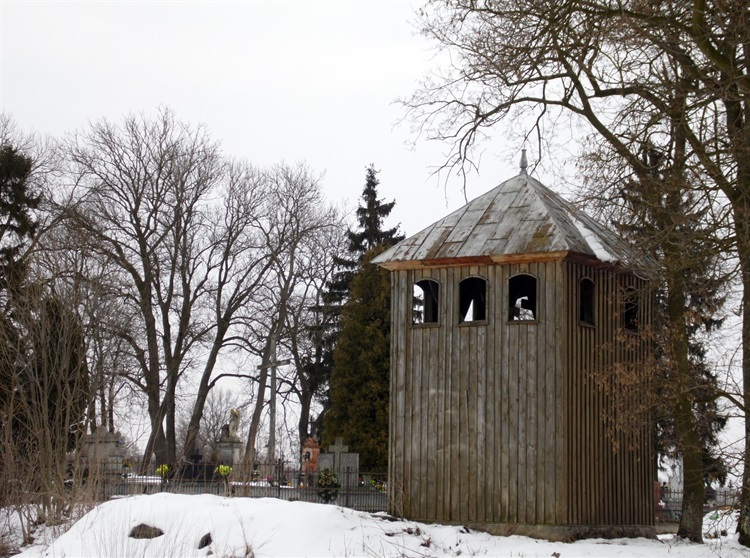 Wzniesiona w XVIII w., jednokondygnacyjna drewniana dzwonnica, usytuowana jest na północny-wschód od kościoła (w pewnym oddaleniu), przy wejściu na cmentarz grzebalny. Konstrukcji słupowej, wzmocnionej ryglami i zastrzałami, zewnątrz oszalowana z olistwowaniem, z dachem krokwiowym krytym blachą. Na rzucie kwadratu, o boku 4,70 m., z wejściem od wschodu. W górnej części każdej ściany od wschodu i zachodu po trzy, od północy i południa po dwa otwory dzwonowe, o kształcie stojącego prostokąta, zakończonego łukiem odcinkowym. Dach namiotowy, zwieńczony blaszaną sterczyną z żelaznym krzyżem.