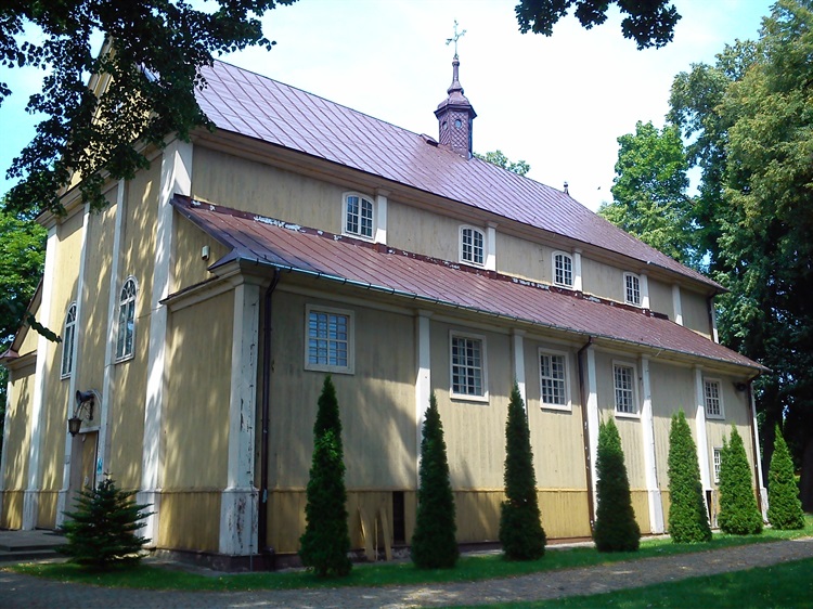 Kościół jest drewniany, konstrukcji zrębowej, oszalowany, trójnawowy, zbudowany na planie prostokąta, z prosto zamkniętym prezbiterium szerokości nawy głównej na rzucie kwadratu. Przy ścianach prezbiterium są dwie zakrystie odpowiadające szerokością nawom bocznym. Od południa mieści się chór muzyczny, nadwieszony i wsparty na dwóch słupach. Nawa główna i prezbiterium nakryte są wspólnym dwuspadowym dachem z trójkątnym szczytem od frontu. Nawy boczne i zakrystie przykryte są dachami pulpitowymi. Nawa główna i prezbiterium oddzielone są od siebie belkami łuku tęczowego i nakryte wspólnym płaskim stropem. Nawa główna oddzielona jest od bocznych słupami arkadowymi, połączonymi łukiem odcinkowym.