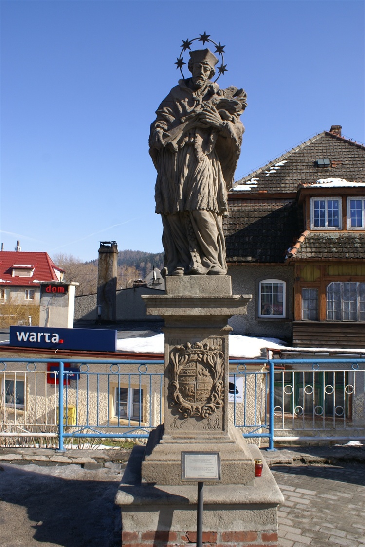 Jedna z nich usytuowana jest w centrum miejscowości, nieopodal mostu na Kamiennym Potoku. Święty stoi na kamiennym postumencie, na którym widnieje herb fundatora Christopha Cajetana von Hardiga oraz 1711 rok, w którym rzeźba została wykonana. Nad głową św. Jana przykrytą biretem umieszczona została gwieździsta aureola.