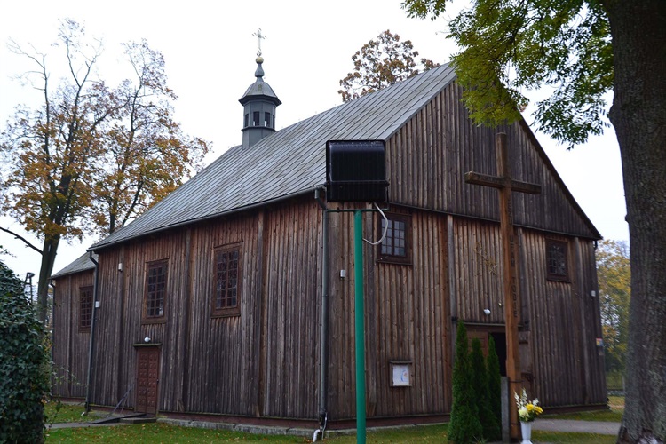 Wnętrze trójnawowe, rozdzielone dwiema parami słupów, przekryte nowym belkowym stropem. Chór muzyczny wsparty na dwóch filarkach z mieczami. Wyposażenie wnętrza: barokowe z XVIII w. Znajdującą się na południowy-zachód od kościoła, jednokondygnacyjną drewnianą dzwonnicę, wzniesiono w połowie XIX w. Remontowana po 1945 r. Konstrukcji słupowej wzmocnionej ryglami i zastrzałami, oszalowana z olistwowaniem. Na rzucie kwadratu o boku 2,70 m. W górnej części ścian wycięte po jednym otworze dzwonowym (prostokąt zakończony łukiem nadwieszonym). Dach krokwiowy dwuspadowy, zwieńczony drewnianym krzyżem.