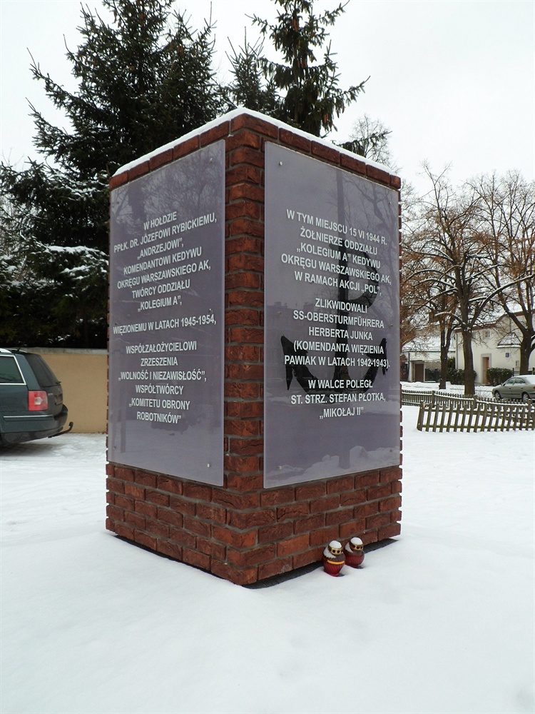 W 2012 r. na małym placyku w miejscu zamachu na SS-Obersturmführera Herberta Junka odsłonięty został pomnik upamiętniający żołnierzy oddziału "Kolegium A" i ich dowódcę ppłka dra Józefa Rybickiego. Warto wspomieć, że Rybicki był członkiem struktur WiN (Wolność i Niepodległość), więźniem okresu stalinizmu oraz współzałożycielem Komitetu Obrony Robotników i Komitetu Samoobrony Społecznej KOR.