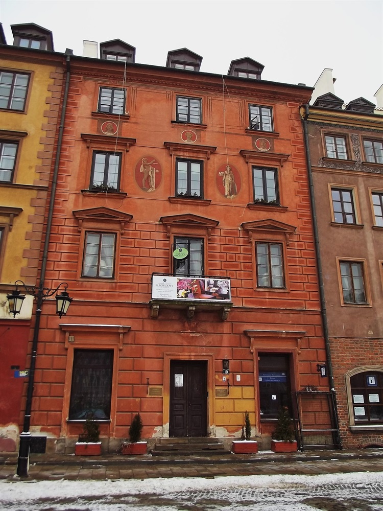 Zburzoną do piwnic w 1944 r. kamienicę odbudowano w 1953 wg projektu Jana Bieńkowskiego. Fasadę ozdobiono polichromią wykonaną przez Krystynę Kozłowską i Grzegorza Wdowickiego.