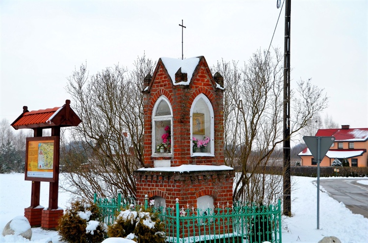 Przy samym wjeździe do miejscowości wita nas kapliczka, stoi ona zarazem na rozstaju dróg. Jest niewielka, murowana z czerwonej cegły, posiada dwie kondygnacje z szeregiem płycin dookoła postumentu. Dolne płyciny z półkolistym łukiem są puste, górne nisze ostrołukowe, dwie z nich są oszklone. W niszy od frontu umieszczono figurę świętego w bocznej obraz Matko Bożej. Całość przykrywa wielospadowy daszek ze sterczynami, na daszku metalowy krzyż.
