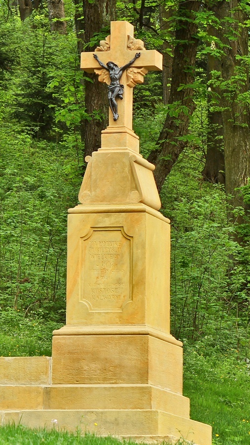 W okolicy Dróżek Kalwaryjskich i Bazyliki Matki Bożej Anielskiej stoi murowany krzyż z wizerunkiem Jezusa Chrystusa. Krzyż ustawiony został w 1901 roku przez X. Stefana Podworskiego - kustosza Kalwarii. Pomnik wzniesiono na pamiątkę wielkiego jubileuszu w 1902 roku. Upamiętnia 300-letnią rocznicę założenia Kalwarii Zebrzydowskiej 1602-1902 roku.