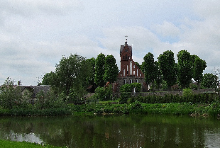 Kościół parafialny, pw. św. Stanisława Kostki znajduje w obrębie dawnego cmentarza parafialnego wygrodzonego kamiennym murem. Świątynia została zbudowana w stylu późnoromańskim, z granitowych bloków na przełomie XIII i XIV wieku. Pozostałością oryginalnego ustroju architektonicznego jest uskokowy portal w elewacji zachodniej. Pod koniec XIX wieku dobudowano po stronie zachodniej, czworoboczną ceglaną wieżę oraz zmieniono formę otworów okiennych, co nadało budowli charakteru neoromańskiego. W 1961 r. kościół został spalony. Odbudowano go trzy lata później. W trakcie odbudowy zrezygnowano z odtworzenia oryginalnej formy hełmu wieży, a w części wschodniej kościoła dobudowano zakrystię, która odbiega od dotychczasowej konwencji stylistycznej świątyni.