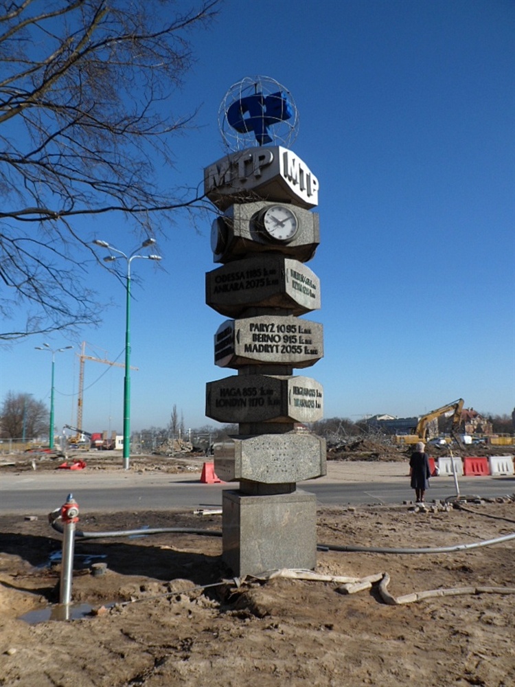 Drogowskaz ten jest pracą doskonałego poznańskiego rzeźbiarza Jerzego Sobocińskiego. Obiekt nazywany obeliskiem Światowida ukończony został w 1973 r. Na granitowych kostkach umieszczono odległości, które dzielą stolicę Wielkopolski ze stolicami państw Europy. Na jednym z elementów umieszczono zegary o podświetlanych tarczach. Szczyt zdobi napis "MTP" i godło poznańskich targów ulokowane w symbolicznej kuli ziemskiej wykonanej z metalowych prętów.