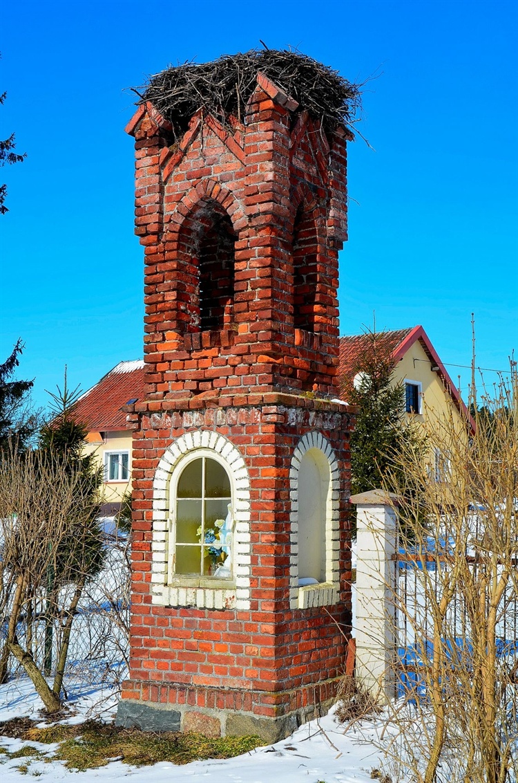 Jest to budowla w stylu neogotyckim, dwukondygnacyjna, murowana z czerwonej cegły. Niestety nie posiada żadnych inskrypcji mówiących o dacie powstania ale można przyjąć, że najprawdopodobniej pochodzi z początku XX w. Dolny poziom to półkoliste wnęki, w części frontowej nisza jest przeszklona i znajduje się w niej figura Matki Boskiej. Górna kondygnacja przedzielona gzymsem to wielostronny prześwit, zapewne kiedyś zawierał krucyfiks lub dzwonek. Całość budowli zwieńczona jest wielospadowym daszkiem i sterczynami.