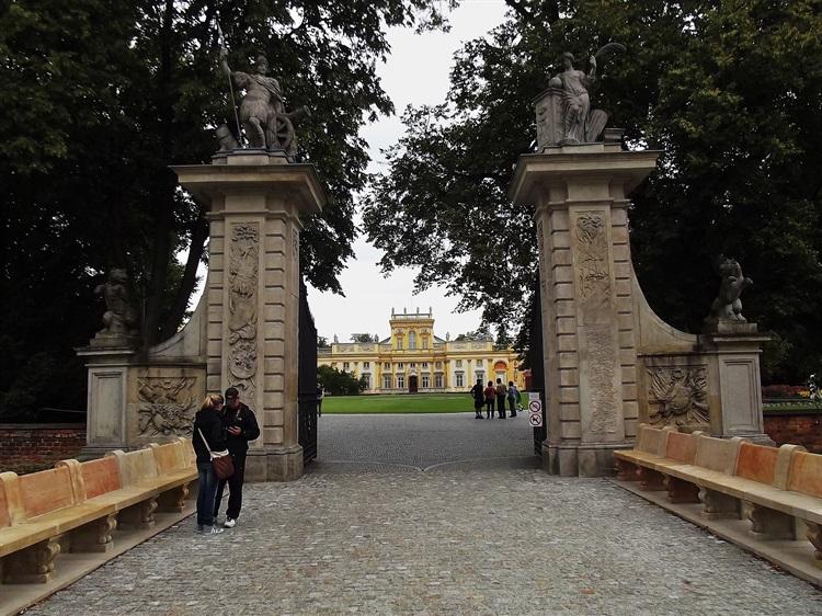 Istniejąca do dnia dzisiejszego, monumentalna brama pałacowa stworzona została pod koniec XVII w. wg projektu nadwornego architekta królewskiego – Augustyna Locciego. Tworzą ją dwa kamienne filary, zwieńczone alegorycznymi rzeźbami: męską i kobiecą. Postać męska przedstawia wojownika w zbroi, z paludamentem narzuconym na ramiona i w szyszaku na głowie, trzymającego w jednej ręce włócznię, a drugą wspierającego się na armacie.
